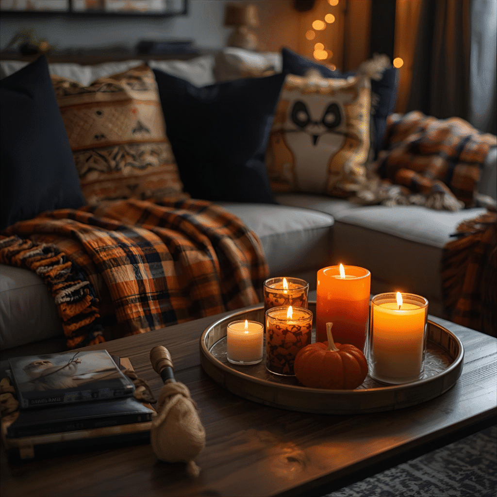 Think about adding some black throw pillows with ghost or pumpkin prints on your couch. You can drape a cozy fall blanket over your favorite chair—those plaid ones work perfectly! Swap out your regular candles for black or orange ones. The flickering light creates such a moody atmosphere.