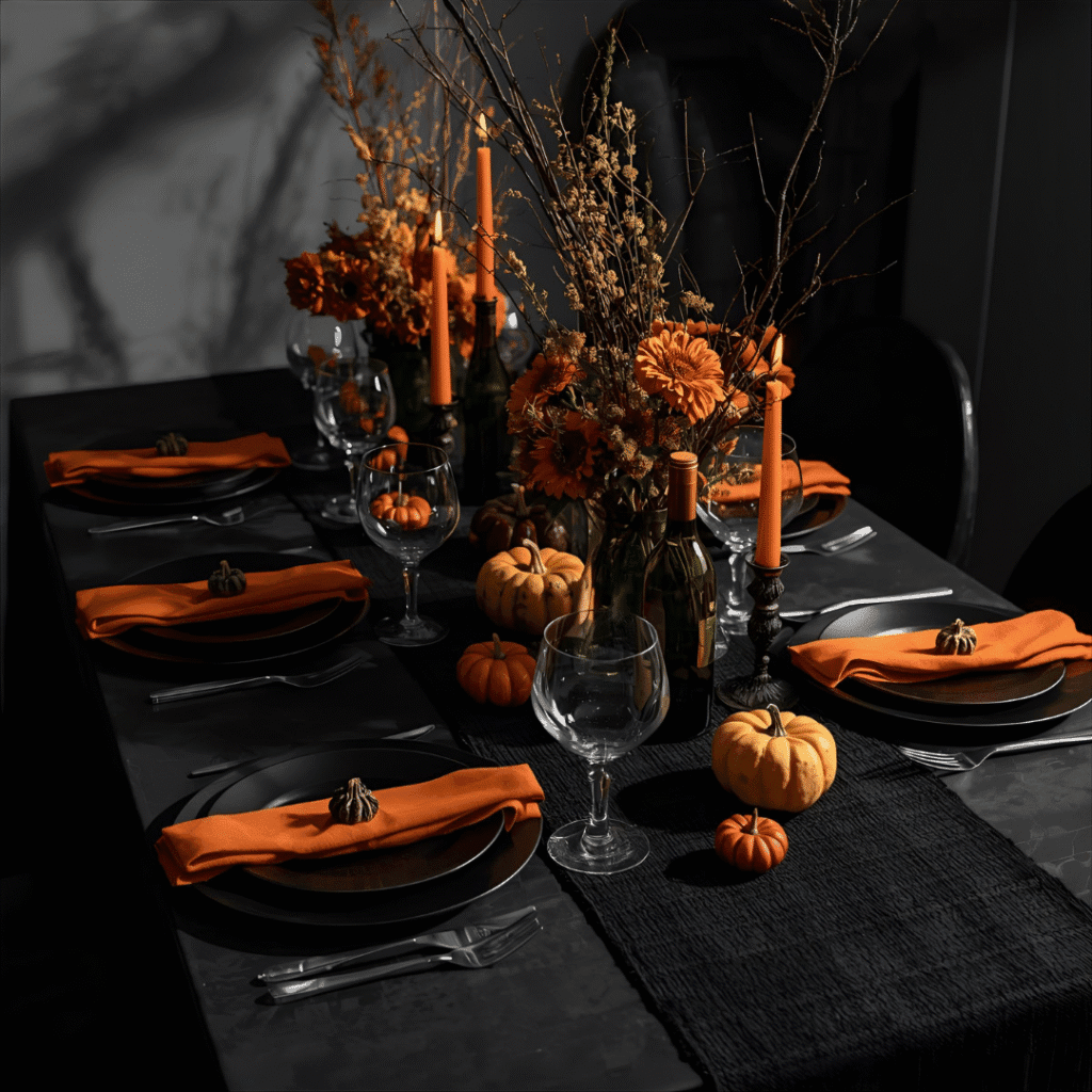 For your dining table, try a black table runner with orange placemats. Add some candles in wine bottles—paint them black and let the orange candles drip down for that haunted house effect. So chic!