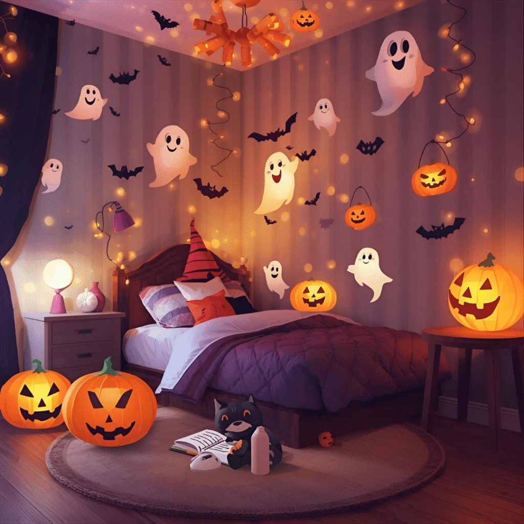 Bedrooms need love too! For kids’ rooms, keep it fun and not too scary. Think cute ghosts, friendly pumpkins, and colorful bats on the walls. You can get removable wall decals that won’t damage the paint.