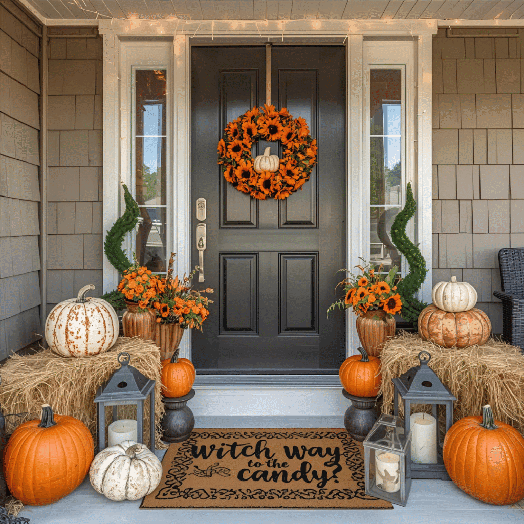 A welcome mat with a fun Halloween message sets the tone right away. Something like “Enter if you dare” or “Witch way to the candy?” adds personality. Throw in some corn stalks, hay bales, and maybe a scarecrow if you have the space.