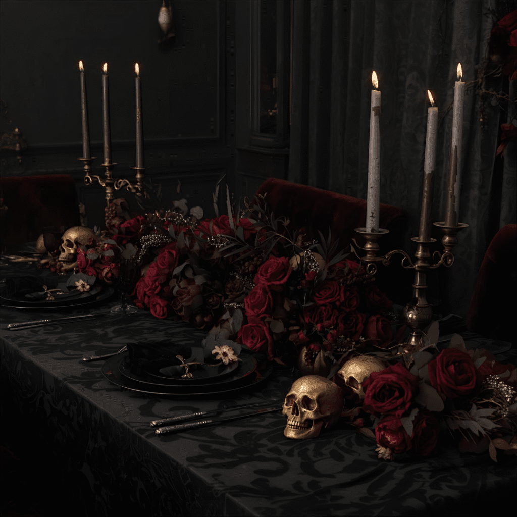 Use candelabras instead of regular candle holders. The more ornate, the better. Add some crystals, dark florals like black calla lilies or deep red roses, and antique-looking mirrors.