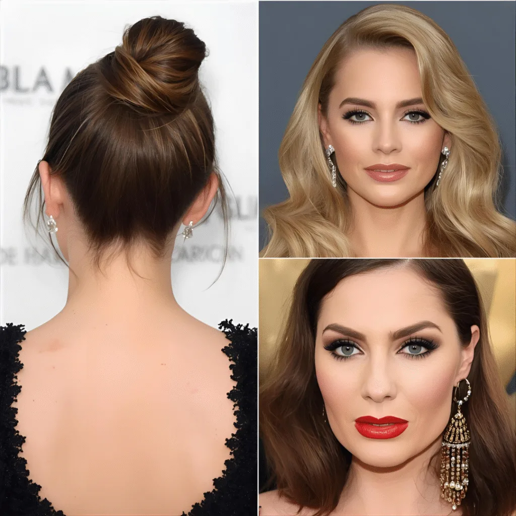 For hairstyles, classic updos, sleek buns, or Hollywood waves all look beautiful. If you’re wearing a statement necklace, an updo shows it off perfectly. Loose waves work great with drop earrings.